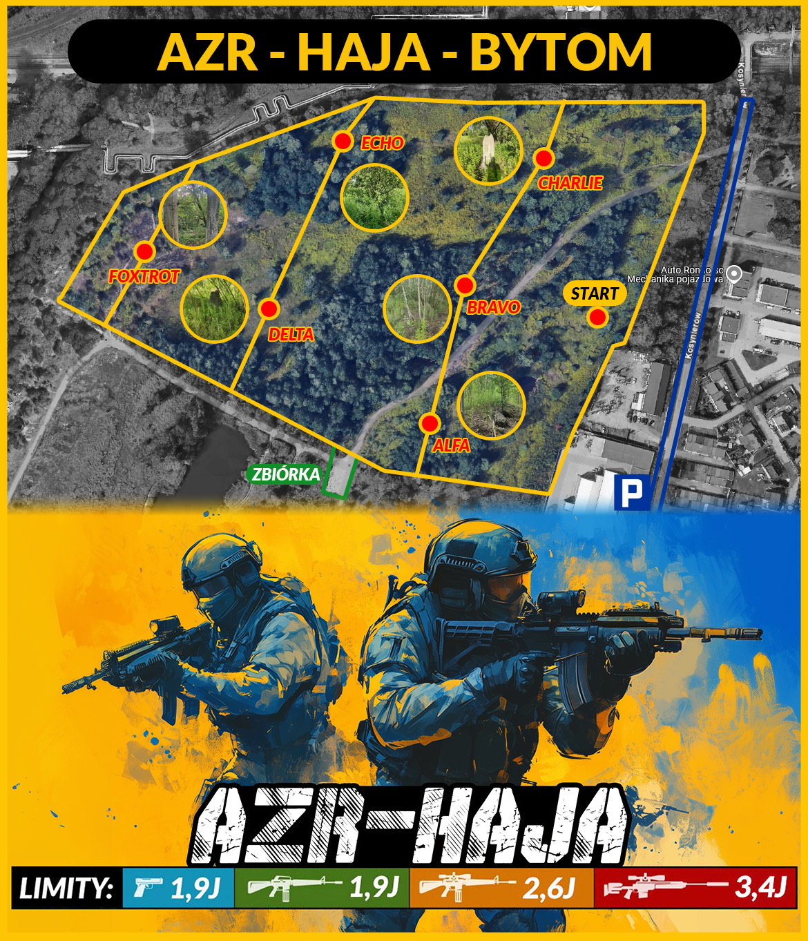 Zakaz przestrzeliwania replik ASG na terenie Parkingu oraz Strefy Off Game. Przestrzeliwanie replik jest możliwe tylko w punkcie Chrono i na Strzelnicy w Strefie Bezpiecznej wyznaczonej przez Organizatora. Wchodząc na teren gry, każdy uczestnik musi mieć ubrane okulary ochronne. Ściągnięcie okularów skutkuje wyrzuceniem z rozgrywek danego gracza. Podczas gry obowiązuje całkowity zakaz spożycia napojów alkoholowych i środków odurzających pod groźbą usunięcia z rozgrywek. Mechanika rozgrywek i środki bezpieczeństwa – W terenie leśnym dozwolony jest ogień automatyczny w replikach o mocy do 1,9J. W momencie trafienia przez przeciwnika należy krzyknąć “Hit” lub “Dostałem” i ponieść rękę. Z podniesioną ręką gracz wraca na miejsce startowe, tzw. “Respa” Tzw. “Złota zasada” – jeśli przeciwnik, nie poczuł kulki, a gracz jest pewien trafienia ponieważ widział miejsce uderzenia, komunikuje “Dostałeś i podaję miejsce w, którym odbiła się kulka” Np. Dostałeś w rękę, dostałeś w kamizelkę itd. Upomniany przeciwnik ma obowiązek krzyknąć “Dostałem” i bez dyskusji udać się do punktu startowego. Jeśli graczowi “wydaje się, że trafił” nie komunikuje fraga. Jeśli sytuacja się powtarza i gracz zaczyna mieć wątpliwości, czy przeciwnik przyznaje się do trafień, należy ten fakt natychmiast zgłosić organizatorowi. Ogień automatyczny jest dozwolony do zawodników, którzy znajdują minimum 5 metrów od strzelającego. “Friendy Fire” w terenie leśnym każde trafienie sie liczy. “Silent Kille”, dotknięcie przeciwnika ręką, zabija go. Zabity gracz komunikuje śmierć tylko poprzez podniesienie ręki. Rykoszety przy grze Leśnej jak i każde najmniejsze trafienie jest uznawane, niezależnie od czego odbiła się kulka. Trafienie w replikę niszczy ją, ale nie zabija gracza. Przestrzeliny – miejsca przez, które można strzelać są dokładnie omawiane podczas BHP przed rozgrywką. Gracz musi zawsze strzelać widząc miejsce, do którego mierzy. Zakaz strzelania na “ślepo” zza przeszkody, a także lufa przy strzale nie może być powyżej linii wzroku. Trafieni gracze nie mogą się komunikować z innymi dopóki nie wrócą do punktu startowego. Zakaz wykorzystywania pirotechniki (granaty hukowe i błyskowe / samoróbki oparte na petardach itd.) z wyłączeniem granatów dymnych zatwierdzonych przez Organizatora. W przypadku pobytu na terenie z dziećmi należy pamiętać, że obiekt jest prawnie zobowiązany do stosowania standardów ochrony małoletnich, ustalenia tożsamości małoletnich i ich relacji z osobą dorosłą, z którą przebywają.